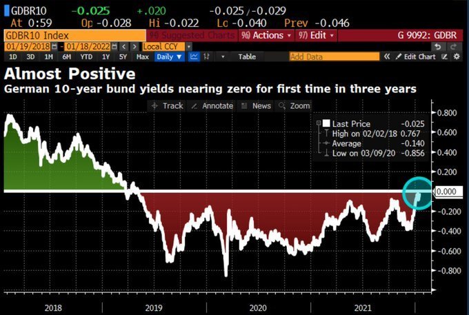 从行情图表看,目前德国10年期国债收益率已无限接近于零。若能在本周顺利完成上破,将有望时隔三年来首度重返正值区间。