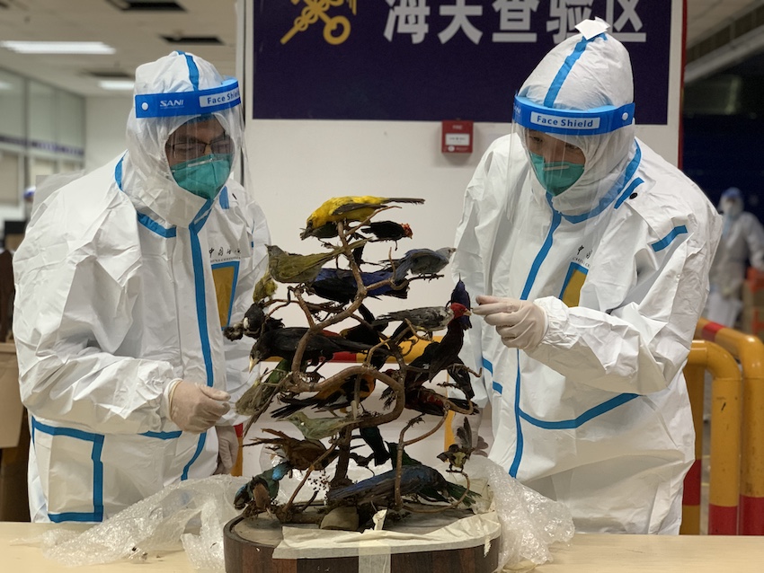 后经上海野生动植物鉴定中心鉴定,有4只标本涉濒危,分别为紫喉蜂鸟、红尾绿鹦鹉、科式蜂鸟和绿胸八色鸫。对照《濒危野生动植物种国际贸易公约》(以下简称《CITES公约》附录)和《国家重点保护野生动物名录》,紫喉蜂鸟、红尾绿鹦鹉和科式蜂鸟均为《CITES公约》附录II物种,绿胸八色鸫为国家二级重点保护野生动物。目前该案已移交相关部门作进一步处理。