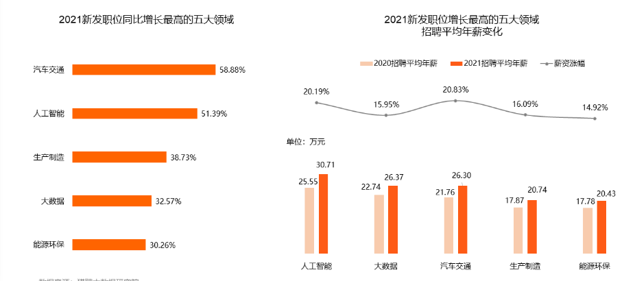 报告显示,2021年新发职位同比增长最多的五大领域是汽车交通、人工智能、生产制造、大数据、能源环保。五个领域对应的平均招聘年薪分别为26.30 万元、30.71万元、20.74万元、26.37万元、20.43万元,与2020年相比,其薪资涨幅分别为20.83%、20.19%、16.09%、15.95%、14.92%。
