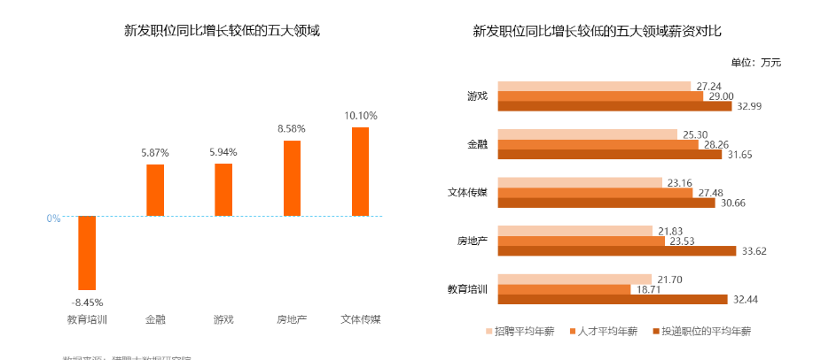 值得一提的是,2021年新发职位增长较差的五个领域是教育培训、金融、游戏、房地产和文体传媒,比2020年增长了-8.45%、5.87%、5.94%、8.58%、10.10%。
