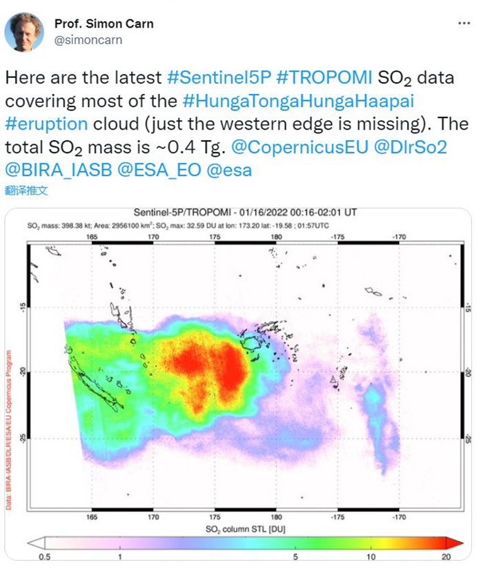 但密歇根理工大学的火山学家卡恩(Simon Carn)在Twitter发文指出,目前的监控数据显示,汤加火山喷发释放的二氧化硫约为0.4Tg,也就是4亿千克。他表示,这个量并不严重。