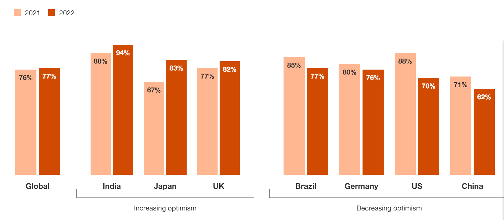 值得一提的是,虽然美国高管对全球经济增长不容乐观,但他们对本国企业的增长前景相对有信心,40%的高管对 2022 年实现收入增长非常有信心。印度高管对他们企业的前景也同样充满信心。