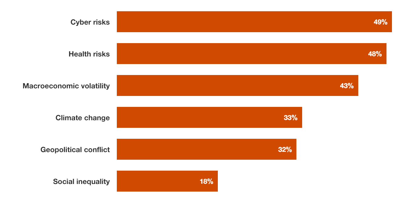 而另一个主要的潜在担忧则是吸引和留住人才的能力——其中69%的高管担心社会不平等风险,并将其视为一种影响,也有62%的高管担心公共卫生风险。