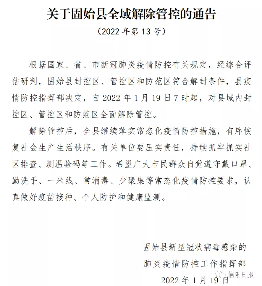“信阳政务”消息,根据国家、省、市新冠肺炎疫情防控有关规定,经综合评估研判,固始县封控区、管控区和防范区符合解封条件,县疫情防控指挥部决定,自2022年1月19日7时起,对县域内封控区、管控区和防范区全面解除管控。