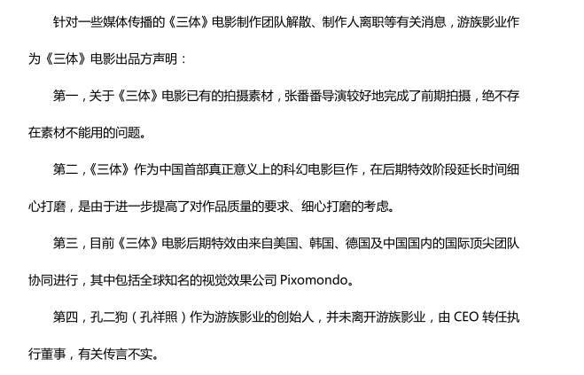 随即,游族影业发布了官方声明: