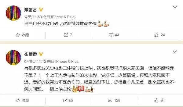 不过故事很快峰回路转。原游族影业CEO孔二狗和张番番导演迅速站出来辟谣。6月17日中午11点58分,《三体》导演张番番发布微博,表示“谣言自会不攻自破,欢迎继续推高热度”。