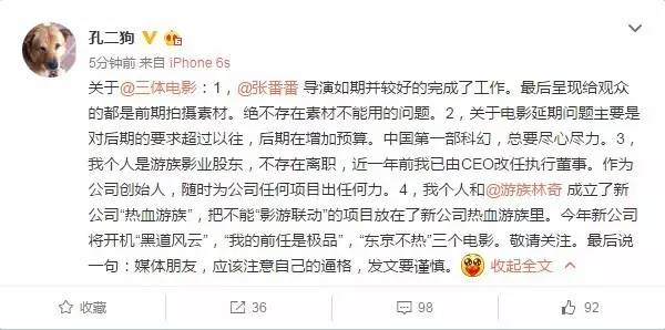 简单说,就是特效正在做,团队国际化,大家别担心。而游族影业创始人孔二狗,确实不再担任游族影业CEO。