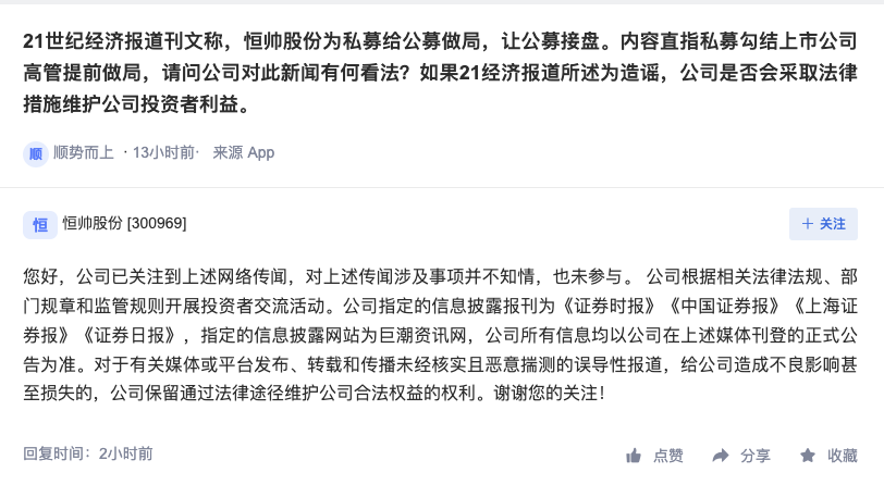 针对公募集体买入恒帅股份为私募接盘传闻,恒帅股份1月19日在深交所“互动易”平台回答投资者提问时称:公司已关注到上述网络传闻,对上述传闻涉及事项并不知情,也未参与。