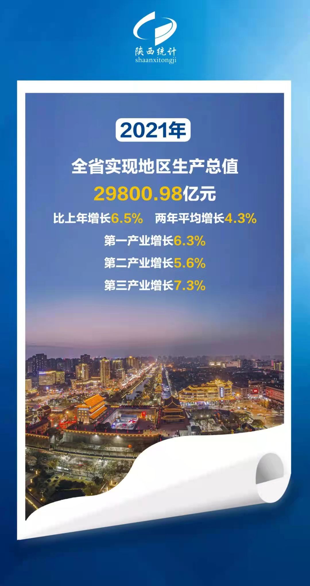 同时,陕西省统计局公布了2021年陕西省GDP数据情况。根据地区生产总值统一核算结果,2021年,全省实现地区生产总值29800.98亿元,按不变价格计算,比上年增长6.5%,两年平均增长4.3%。其中,第一产业增长6.3%,两年平均增长4.8%;第二产业增长5.6%,两年平均增长3.4%;第三产业增长7.3%,两年平均增长4.9%。