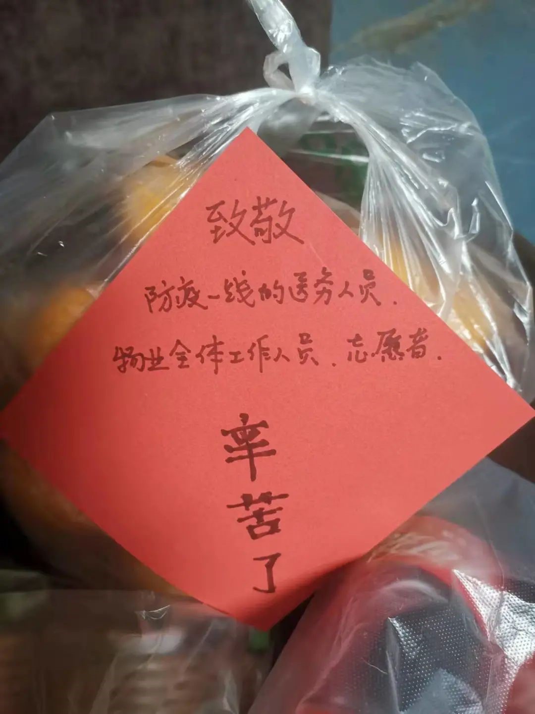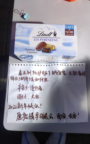 而在天地源专班志愿者下沉的小区,住户的关爱恰如冬日里的暖阳。“看不到防护服下的面容,只能看到你们的守候与付出,谢谢大白!”随着纸条一起,还有一份跨年夜的礼物——一盒巧克力。