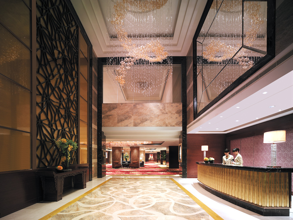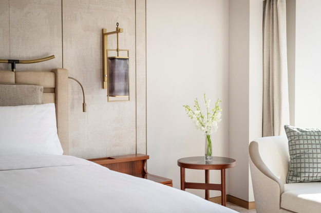 客房内以胡桃木精心雕琢,地毯上隐喻财富的金色“水流”在灯光的照射下映衬出网格图案,紫禁城城楼暗纹若隐若现,与大堂的经典装饰相呼应,黄油皮革床头和壁纸打造的典雅舒适感,橡木和胡桃木家居延续了皇家经典,以及意大利大理石和花岗岩的桌面、手工复古黄铜水晶灯……东西方元素的结合给不少人带来了打破刻板印象的新中式之感。
