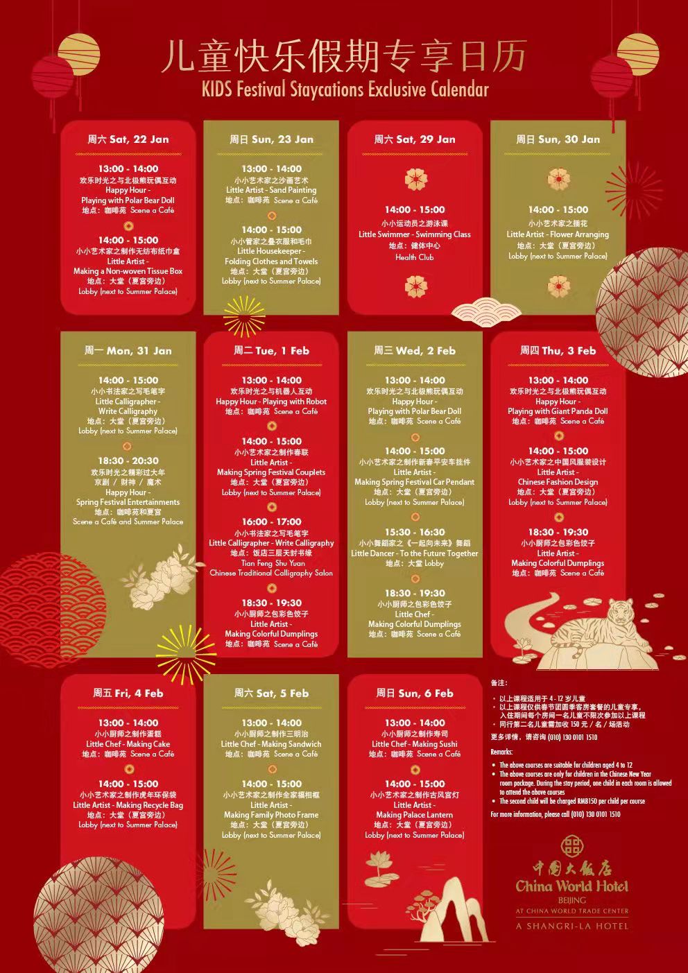 酒店内推出的“儿童快乐假期专享日历”亲子活动也值得一试,从1月22日开始,每个周末以及春节期间都开设了不同项目,包括与北极熊玩偶或机器人互动、制作无纺布纸巾盒、制作春联、体验沙画、游泳课、插花、学写毛笔字、包彩色饺子等。此外,套餐内还包括了国贸商城的会员礼遇以及国贸溜冰场的体验,感受奇幻冰雪世界。