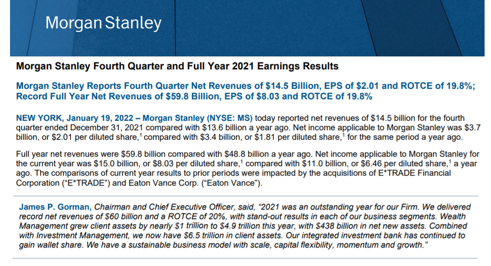 摩根士丹利董事长兼首席执行官James Gorman在声明中表示,公司在2021年度实现创纪录的600亿美元营收,每一个业务部门都给出了出色的业绩。过去一年里摩根士丹利的财富管理规模上升1万亿美元至4.9万亿美元(其中净资产增长4390亿美元),算上投资管理部门,在管客户总资产规模达到6.5万亿美元。