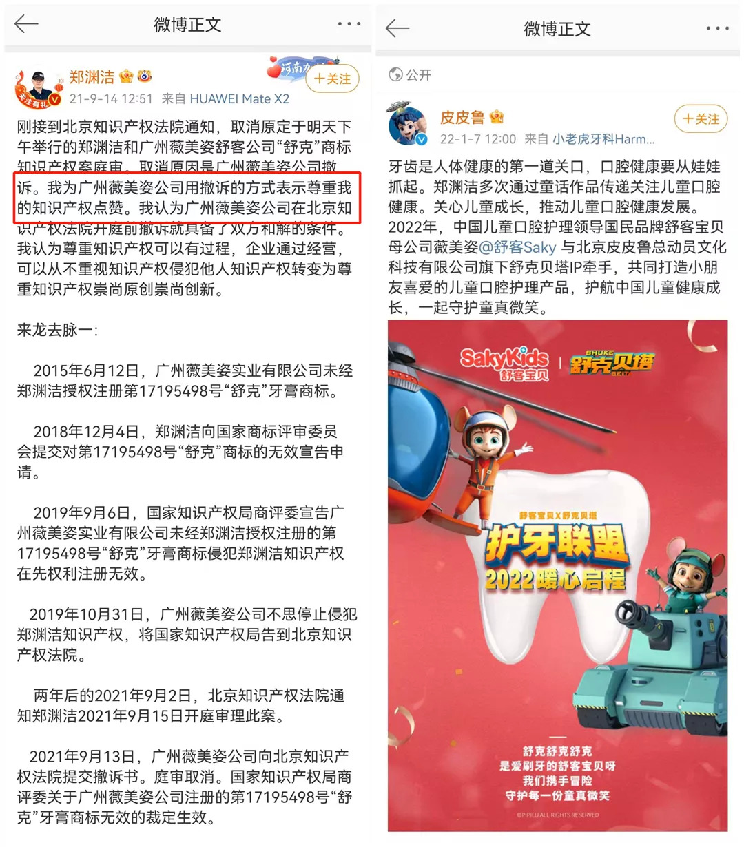 另外值得一提的是,今年1月,皮皮鲁官博官宣了舒客宝贝与北京皮皮鲁总动员文化科技有限公司旗下舒克贝塔IP,将展开联名的消息。