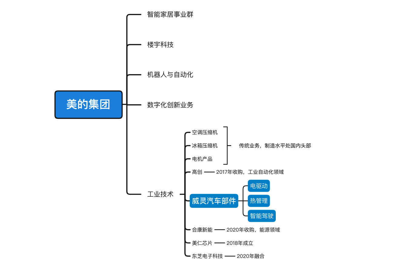从组织架构来看,美的集团目前有五大事业部,美的威灵是工业技术事业部下的产品公司,负责汽车部件。工业技术事业部被视作美的集团向toB进军的重要战队,下分四大板块:消费电器、智慧交通、工业自动化、绿色能源,具体下分八个产品公司。