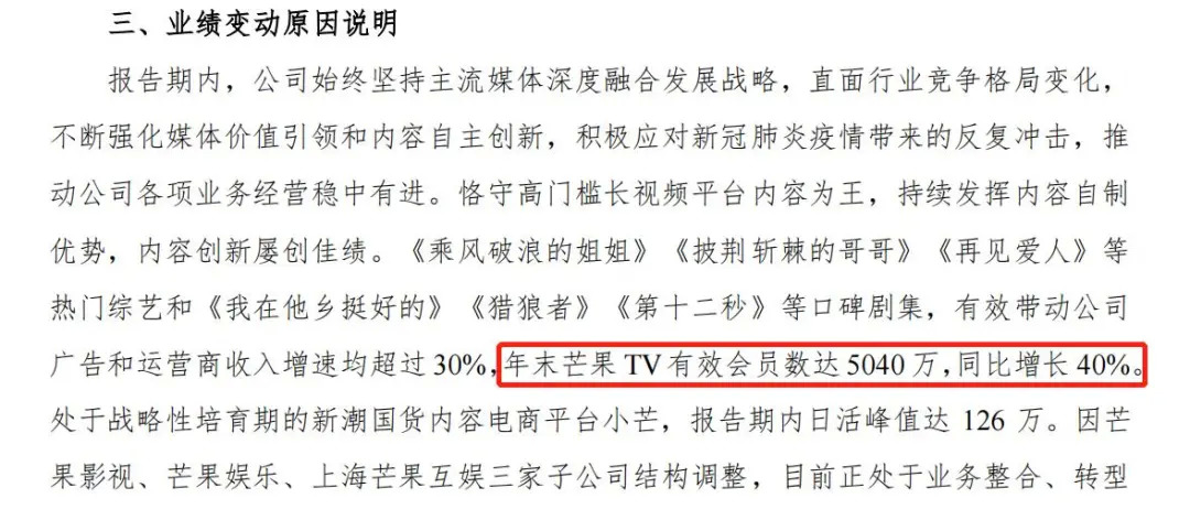 1月20日晚上,芒果超媒披露2021年业绩预告,其中显示,年末芒果TV有效会员数达5040万,相较于去年,会员数量同比增长40%。