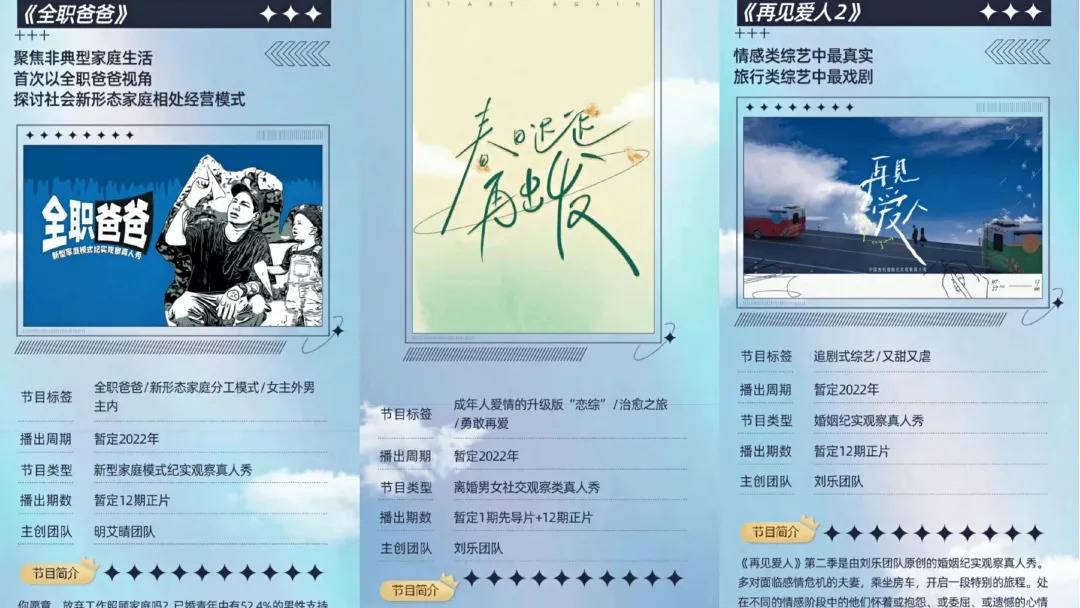 另一边是小而美精品内容赛道,在2021年《再见爱人》的成功之后,芒果TV也似乎认识到了发展小而美内容的重要性,今年将继续打造《春日迟迟再出发》,包括还有像全新的家庭综艺《全职爸爸》等。