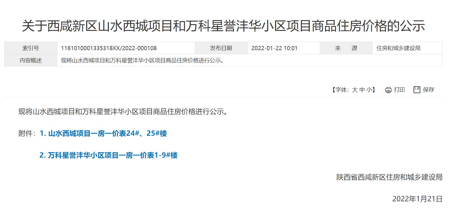 西咸新区沣东新城的万科星誉沣华小区项目(万科未来星光)、山水西城(天地源蘭樾坊)2盘价格公示,万科未来星光761套精装房源、天地源蘭樾坊48套毛坯房源,共计809套房源。