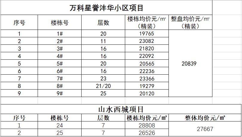 万科星誉沣华小区本次价格公示了9栋楼,面积区间95.8-249.89㎡,整盘均价20839元/㎡,精装修交付;山水西城加推的是2栋洋房,面积较大,集中在203.15-220.27㎡,房源不多,仅有40套,均价27667元/㎡,毛坯交付。
