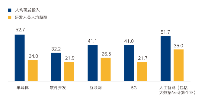 人均薪酬上,人工智能企业人均薪酬为27.5万元,高出A股整体14.3万元,员工激励度领先A股整体。在以高科技行业代表细分行业中,人工智能行业的人均研发投入和研发人员人均薪酬均处于相对领先地位,以期保持其在人才市场的竞争力。