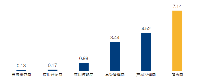 与之相反,高级管理岗、产品经理岗和销售岗等其他岗位均处于人才供应远大于需求的状态,人才供需比分别为 3.44、4.52 和 7.14,人才供应充足。