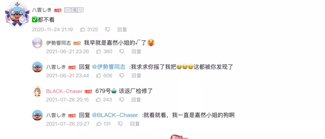 然而在一年半之后的今天,“八雲しき”的ID后面赫然挂着「一个魂(12级)」,这是A-SOUL高级粉丝铭牌的意思。在被挖坟处刑之后,ta回复说:“我一直是嘉然小姐的狗啊”。