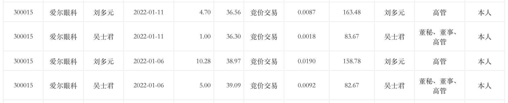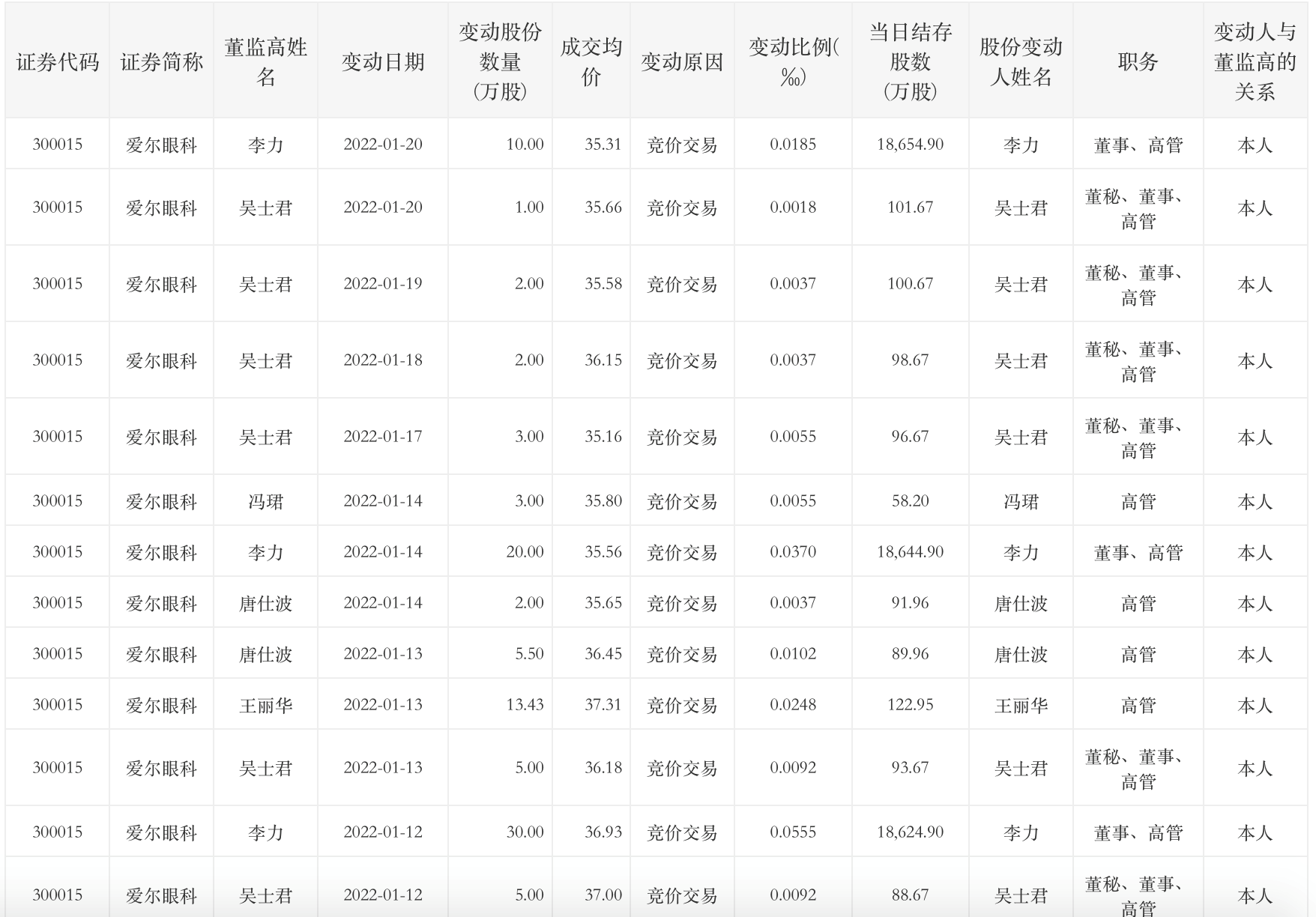 增持的高管不仅仅于此。1月13日爱尔眼科又收到来自副总经理唐仕波和副总经理王丽华通知,唐仕波通过深交所交易系统增持了公司股份共计5.5万股;王丽华通过深交所交易系统增持了公司股份共计13.43万股。而1月13日这天,吴士君继续出手,购入了5万股。