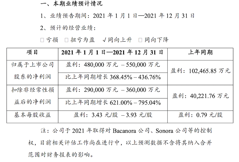 1月24日晚间,赣锋锂业发布2021年年度业绩预告,预计2021年归属于上市公司股东的净利润为48亿元到55亿元,同比增长368.45%到436.76%,基本每股收益为每股3.43元到3.93元。