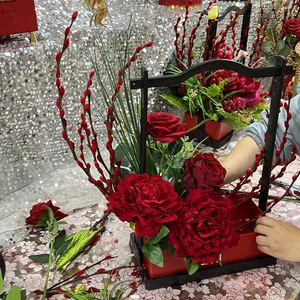 “福桶”被他们视作是今年年宵花的爆款,在岭南花卉市场几乎每个档口最明显位置都能找到它的身影,采用新鲜红色银柳与干花、干叶(多为金色)进行搭配,有的加入了吉祥物或公仔,有的则走国风路线,价格从38元到220元不等。
