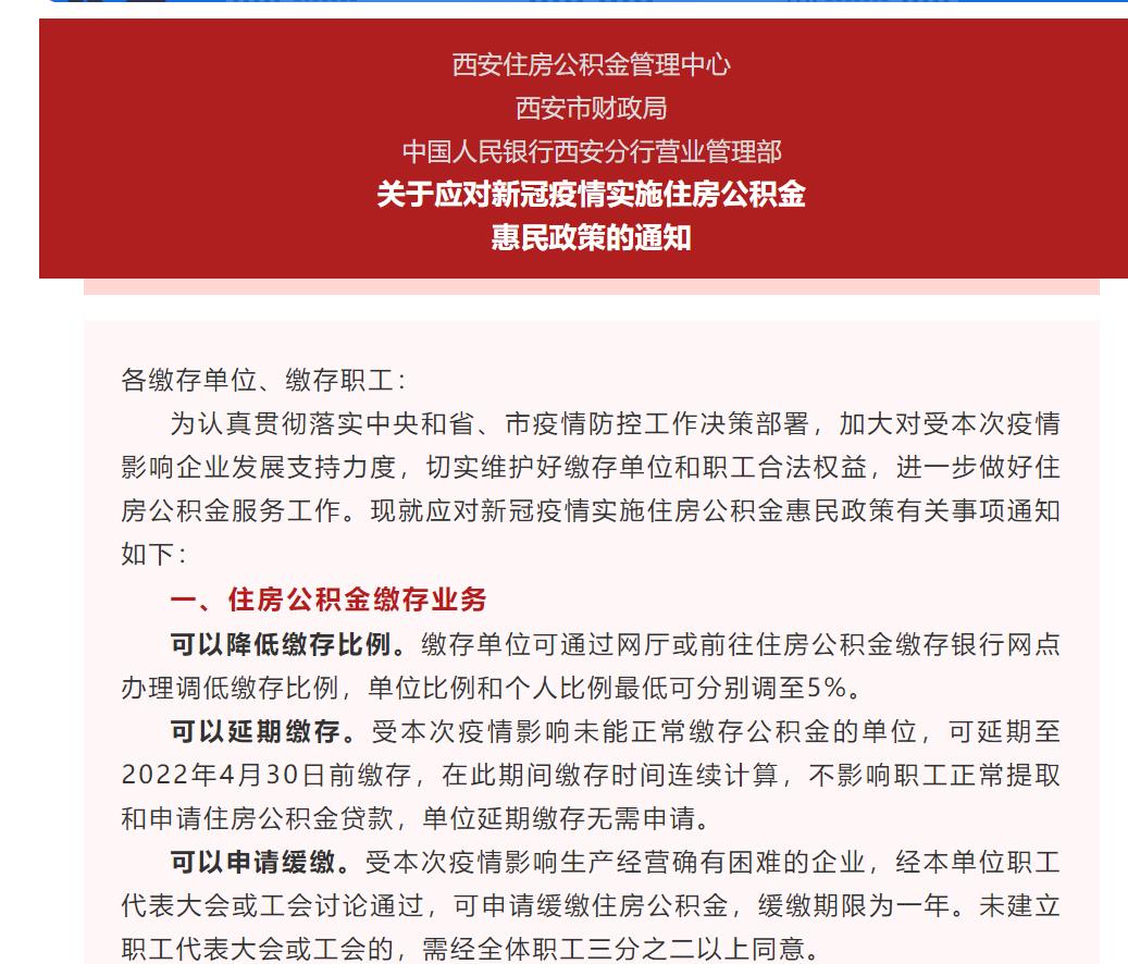 《西安住房公积金管理中心西安市财政局中国人民银行西安分行营业管理部关于应对新冠疫情实施住房公积金惠民政策的通知》全文: