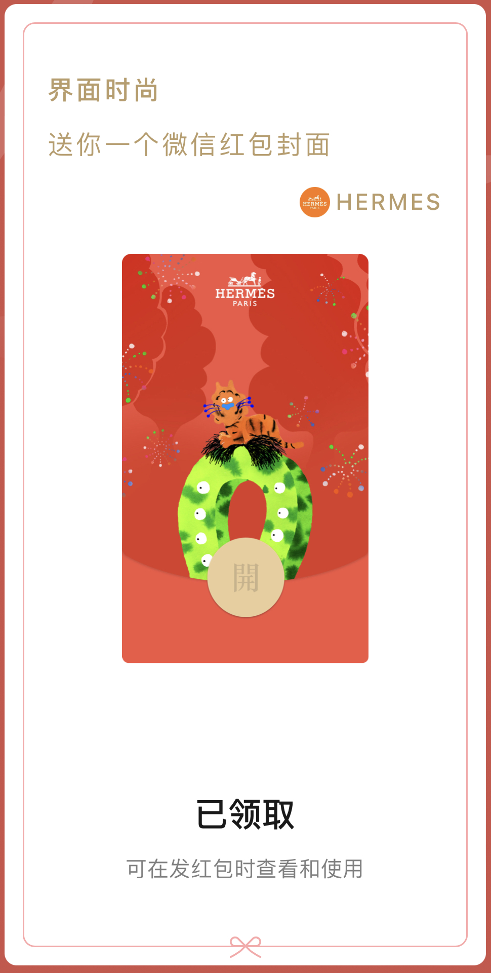 但也有变化不大的地方。虽然领取门槛宽松了许多且大部分品牌的红包封面发放数量都能达到10万级别,但整体上依然供不应求——爱马仕和古驰等头部品牌的虎年红包封面都是在推出后的数小时内被迅速抢完。