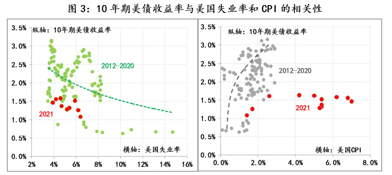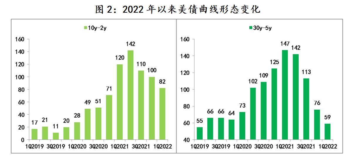 第四,美债收益率依然远离趋势线。目前,仅就美国通胀和就业的情况而言(CPI已升至7%,失业率降至3.9%),美国经济已“过热”,且从2012年以来美债收益率与CPI、失业率的相关性来看,目前10年期美债收益率明显偏离了趋势线,所以伴随通胀快速上升,市场对美联储落后曲线的诟病就持续不断,因此对于美联储而言,其首要任务就是实现“软着陆”,即在不伤及就业的同时,尽快把通胀压力平抑下来,但从图2美债利差变化来看,市场对此信心不足。