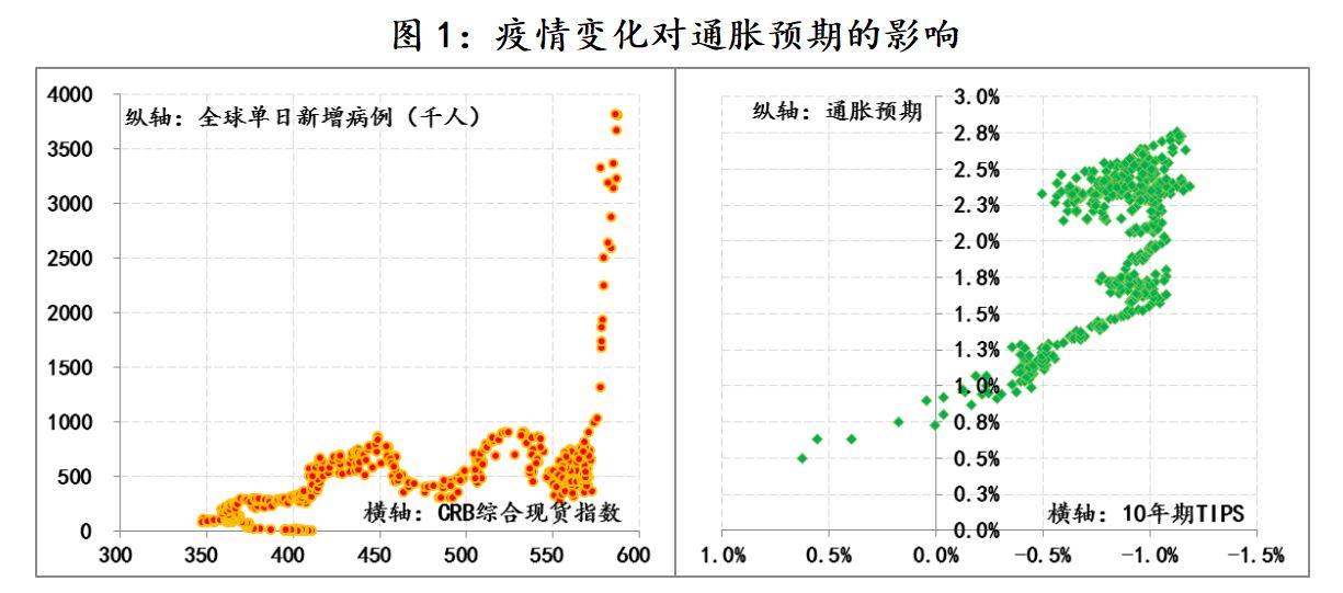 其次,疫情对通胀预期的推升影响趋缓。因奥密克戎变异病毒而起的新一轮疫情,令单日新增病例数呈现直线上升态势,2021年12月27日突破100万例之后,最高于2022年1月21日突破380万例,目前仍在300万例左右,同期商品价格保持了基本稳定,CRB现货综合商品指数基本稳定在590附近,但也未明显回落(有关全球供应短缺和通胀难消趋势,参见《为何本轮通胀不是暂时性的》);另外从推升美债收益率上升因素也由通胀预期转为实际收益率(TIPS),例如, 今年以来10年期美债名义收益率的上升均来自于实际收益率的推升,10年美债实际收益率(TIPS)已上升近50BPs至-0.5%左右,而10年期美债包涵的通胀预期则由去年末的2.6%回落至2.4%。