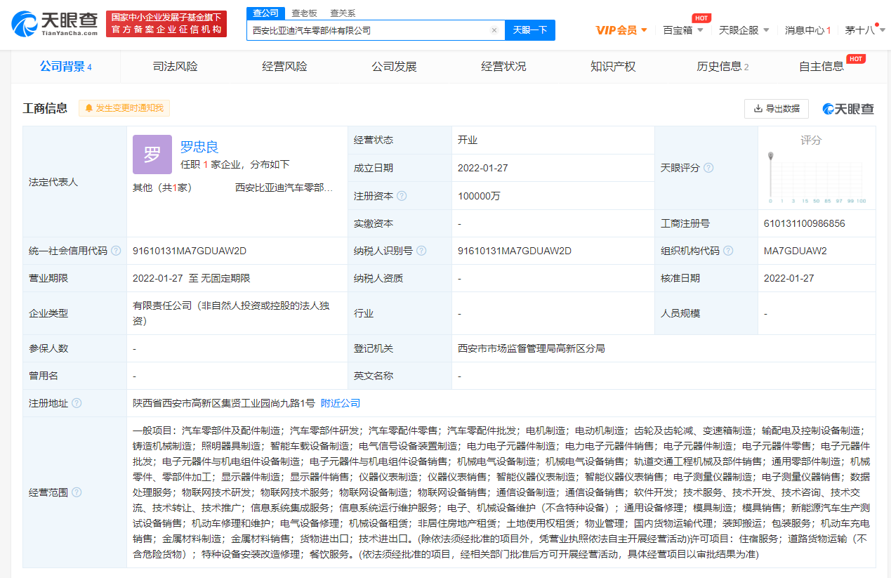 据天眼查App显示,1月27日,西安比亚迪汽车零部件有限公司成立,法定代表人为罗忠良,注册资本10亿元,经营范围含汽车零部件及配件制造,汽车零部件研发零售等。股东信息显示,该公司由长沙市比亚迪汽车有限公司全资持股。