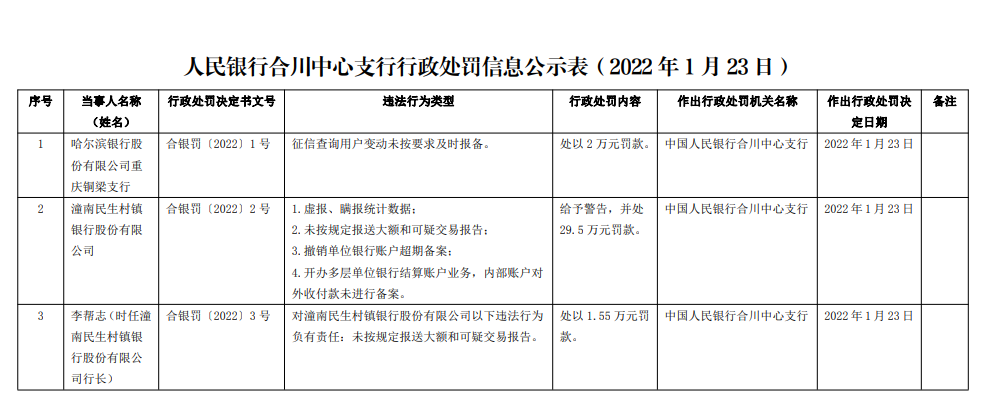 在1月27日,人行重庆营管部公布的处罚信息中,还对哈尔滨银行股份有限公司重庆铜梁支行的处罚。该行因征信查询用户变动未按要求及时报备,被处以2万元罚款。
