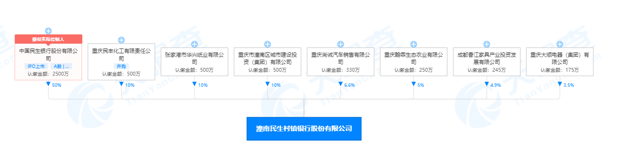 股权构结上,中国民生银行持有潼南民生村镇银行50%股份,是该行大股东,认缴出资额2500万元。此外,重庆市潼南区城市投资(集团)有限公司、重庆民丰化工有限责任公司等7位股东均持有该行10%至3.5%不等的股份。