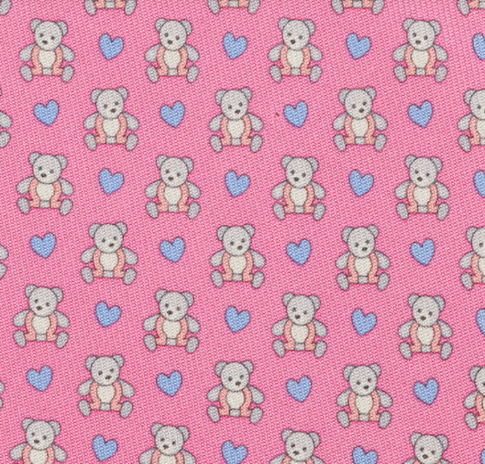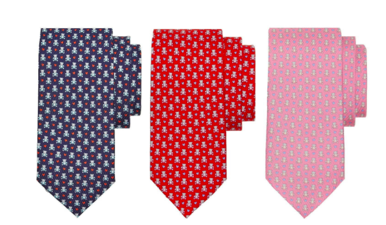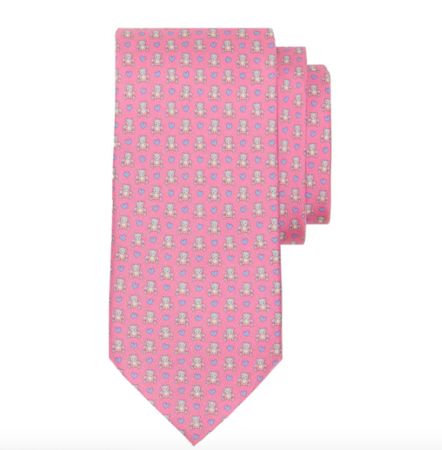 菲拉格慕情人节男士系列中最推荐的是一款桑蚕丝领带饰有Gancios泰迪熊和爱心组成的几何图案,活泼可爱,尽显灵动意趣!是情人节示爱佳礼,给传统的领带样式增加潮酷气质,也可为男士单调的商务造型增添一丝浪漫气息。图案中泰迪熊之间放置了一个心形图案,图案设计十分迷你,不失男士的低调沉稳,成年男性也能轻松驾驭。