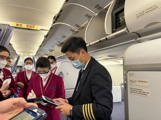 接受界面新闻采访过程中,邢远博机长还“情景还原”了一遍除夕机上广播,带记者感受了除夕航班的氛围—— “今天我们乘坐的是CZXXXX航班,飞行时间X个小时,从浦东飞往XX,航路天气多云,略有颠簸,请您就座后系好安全带,放松并享受你的旅程,今天是除夕,我谨代表机组成员祝大家新年快乐,万事如意”。