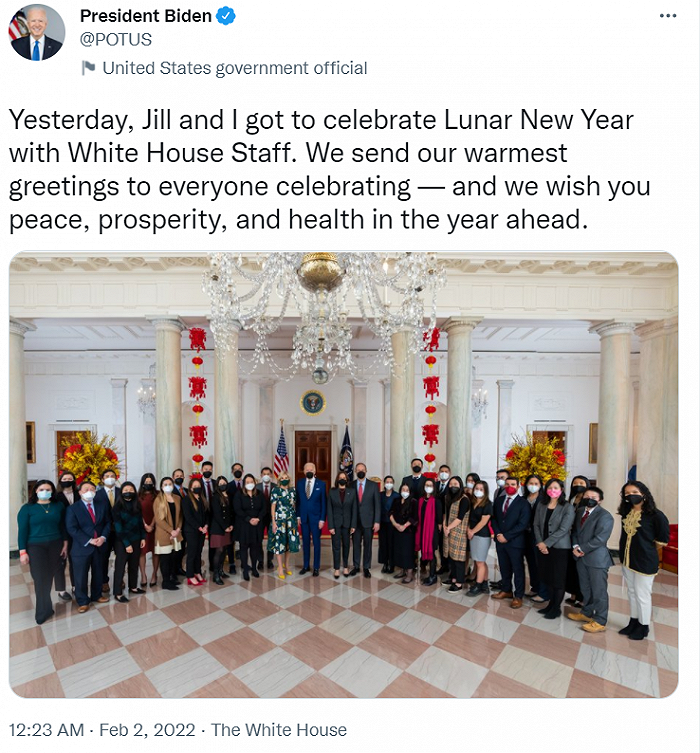 美国总统拜登当地时间2月1日在其官方推特发文,庆祝农历新年。他发推文称:“昨天,吉尔和我与白宫工作人员一起庆祝农历新年。我们向所有过节的人致以最热烈的问候——祝愿你们在新的一年里平安、繁荣和健康。”