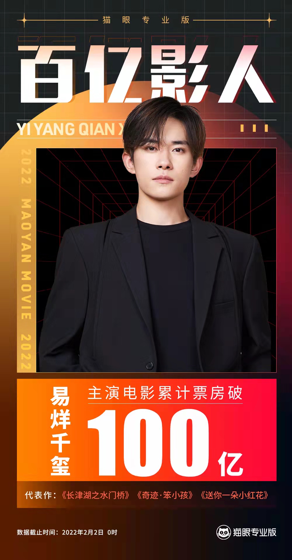 猫眼专业版数据显示,2022年2月2日零时,易烊千玺主演票房破100亿,成为首位00后百亿影人。