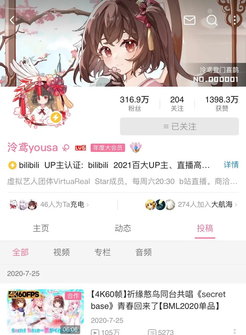 偶像无论虚实,实力始终是硬通货。登上拜年纪的那些虚拟UP主,都在B站展开过数年的内容输出和精细运营。2016年,泠鸢yousa就开始在站内投稿,持续分享音乐视频,原创、翻唱、改编,类型丰富。 她先后投递的128首音频里,《流光乐夜》《千里邀月》《新·九九八十一》等优秀代表作,既是其跟核心粉丝互动的纽带,也是激活潜在受众的养分。截至发稿,泠鸢yousa已斩获B站粉丝316.9万,获赞1398.2万次,足见受欢迎程度。