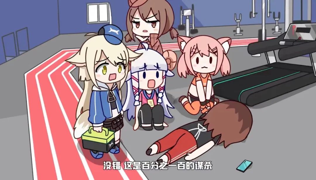 《弈》从词曲到PV,无一不带国风古韵。拜年纪结束后,这则单品播放量突破117万,成了站内热门作品。在“如何评价2022拜年纪单品《弈》”的知乎话题下,业余棋手、作词人、虚拟偶像爱好者前来作答,给出了不同角度的解读和点评,进一步推动着作品传播。 更令人惊喜的是,现在的虚拟UP主不但唱跳俱佳,还在拜年纪演起了“小品”。 《健身房鲨人事件》阵容强大,Hanser、Hiiro、勾檀、咩栗和七海nana7mi五位主演,在B站都是响当当的角色。当然,观众认不出演员也没关系,被搞笑反套路的悬疑剧情所吸引的不在少数。