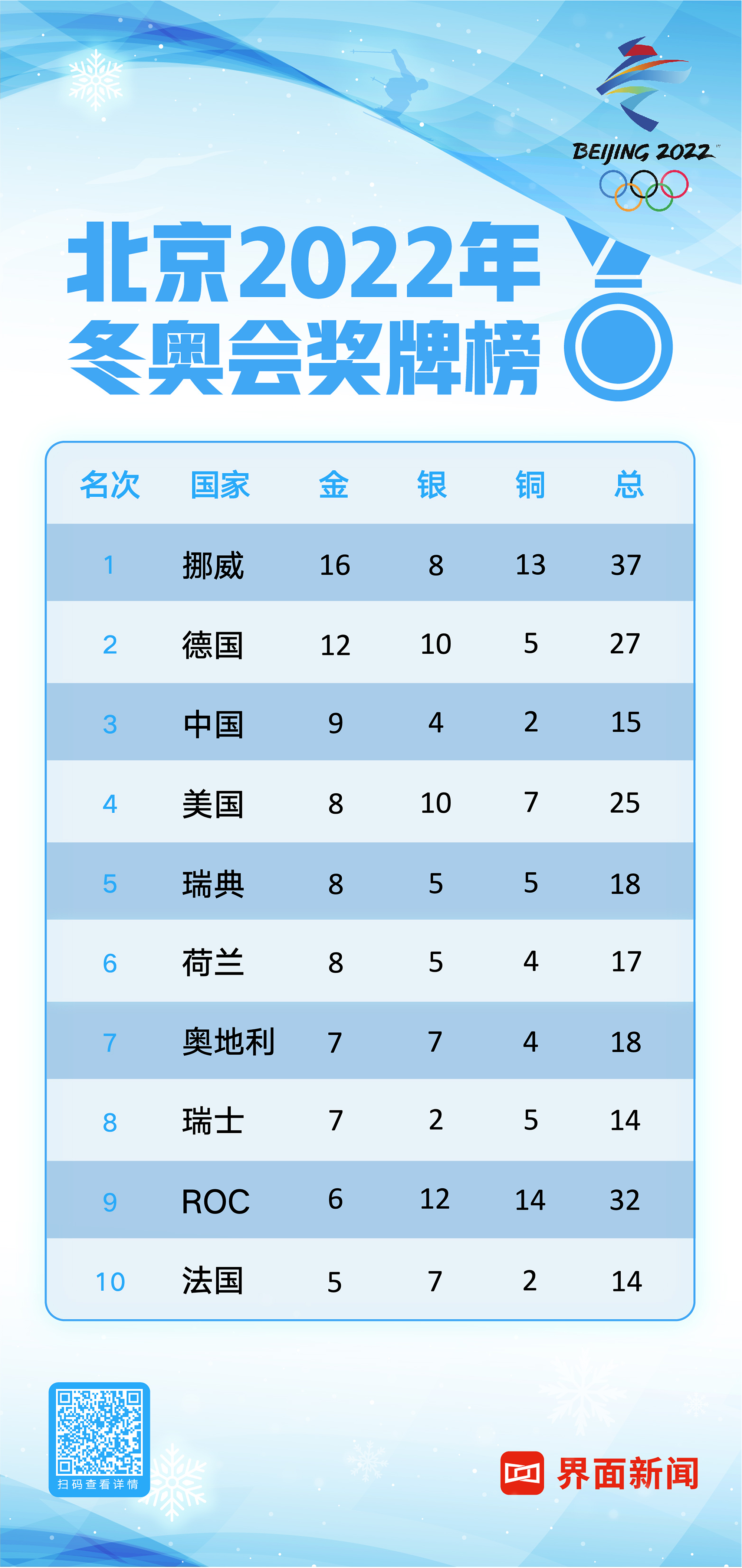 北京2022年冬奥会奖牌榜