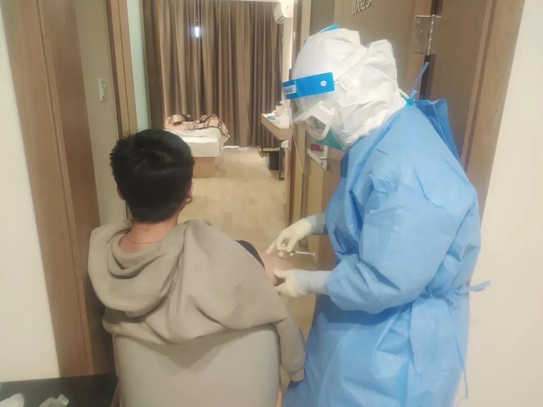此轮医学集中隔离观察点驻守任务正逢新春佳节,虹口区家庭医生蔡若新主动加入到驻点医疗保障小组。年近60岁的他,与年轻组员们一起完成核酸采样、人员转运、医废处理等高强度保障工作;过年期间,值班小组接到通知需要去金山接治愈患者回来,蔡医生二话不说穿起防护装备,在来回3个多小时后顺利将隔离人员接回,脱下防护服,浑身已经湿透。