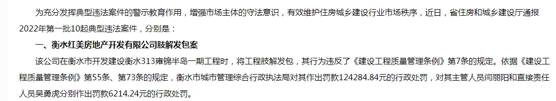 据河北省城乡和住房建设厅通报2022年第一批10起典型违法案件显示,该公司在衡水市开发建设衡水313雍锦半岛一期工程时,将工程分解发包,其行为违反了《建设工程质量管理条例》第7条的规定。依据《建设工程质量管理条例》第55条、第73条的规定,衡水市城市管理综合行政执法局对其作出罚款124284.84元的行政处罚,对其主管人员闫丽阳和直接责任人员吴勇虎分别作出罚款6214.24元的行政处罚。据衡水市城市管理综合行政执法局的处罚事由显示,衡水红美房地产开发有限公司开发建设的衡水313雍锦半岛一期工程总承包单位是上海建工七建集团有限公司。衡水313雍锦半岛一期工程外装及屋面瓦供货安装工程由建设单位肢解发包给河北运盛建筑装饰工程有限公司。该行为违反了《建设工程质量管理条例》第七条第二款之规定。