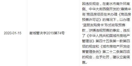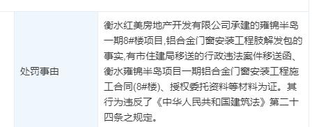 这已是该公司因为同样的问题收到的第二份行政处罚。衡水市城市管理综合行政执法局在2021年5月24日的一条处罚信息显示,衡水红美房地产开发有限公司承建的雍锦半岛一期8#楼项目存在铝合金门窗安装工程肢解发包的事实,其行为违反了《中华人民共和国建筑法》第二十四条之规定。依据《建设工程质量管理条例》第五十五条、第七十三条之规定,参考《衡水市城市管理综合行政执法局行政处罚自由裁量权标准》第一百二十一条,自由裁量情形第二档之规定,衡水市城市管理综合行政执法局决定对衡水红美房地产开发有限公司作出行政处罚。