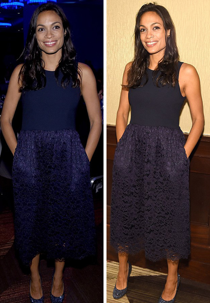 当晚寡姐还有跟演员罗莎里奥·道森合影,罗莎里奥穿了一条深蓝色无袖长裙,下身部分是镂空设计,时尚感十足。罗莎里奥的妆发也十分轻简,一头黑发微微卷起,配上透明唇膏和恰到好处的眼妆,显得清爽可人。