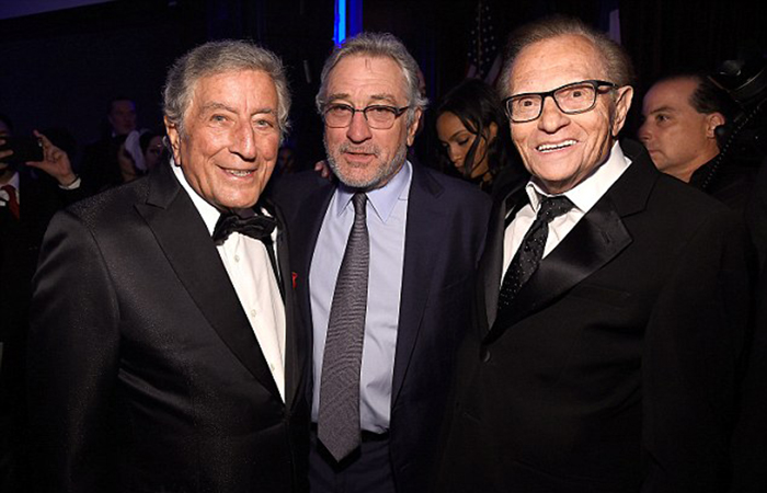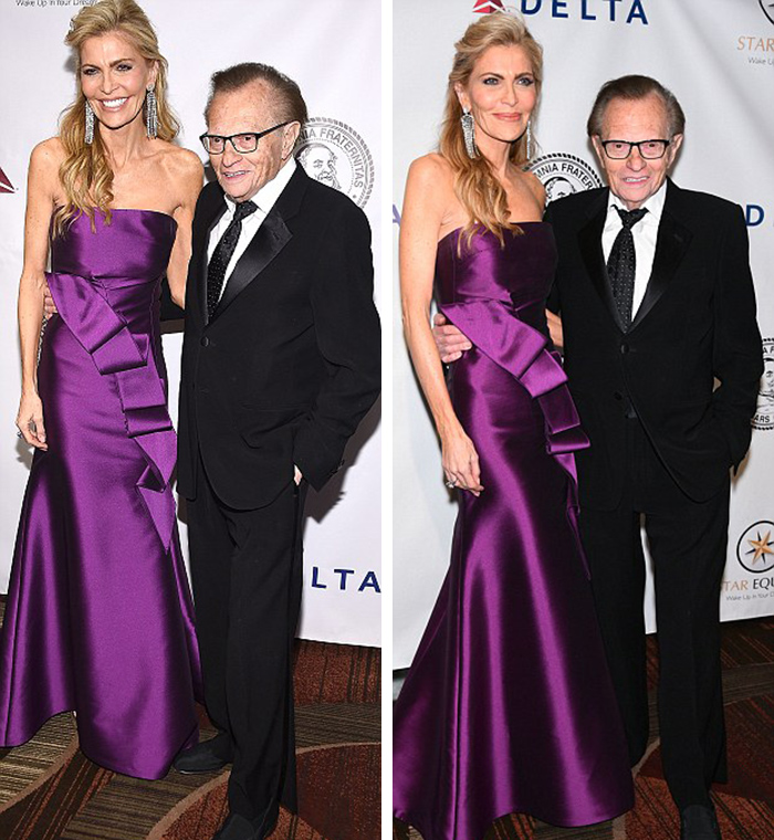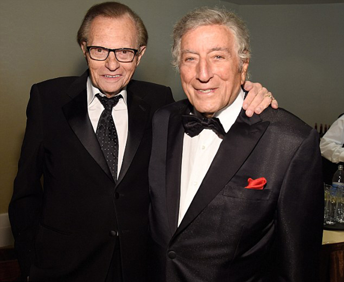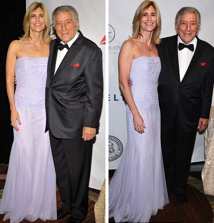 托尼今年89岁,和他一起出席红毯的是妻子苏珊·克劳(Susan Crow),苏珊当晚穿了一件平口礼服,配件是一条简洁的项链和一枚钻戒。82岁的记者拉里·金也参加了当天的晚会,和56岁的妻子肖恩·萨斯威克一同登上红毯。拉里当晚一身黑西装,里面是一件白衬衫,脚上也是一双黑鞋,领带也是黑的。肖恩穿了一件紫色晚礼服,裙身上缝了荷叶边作为装饰。