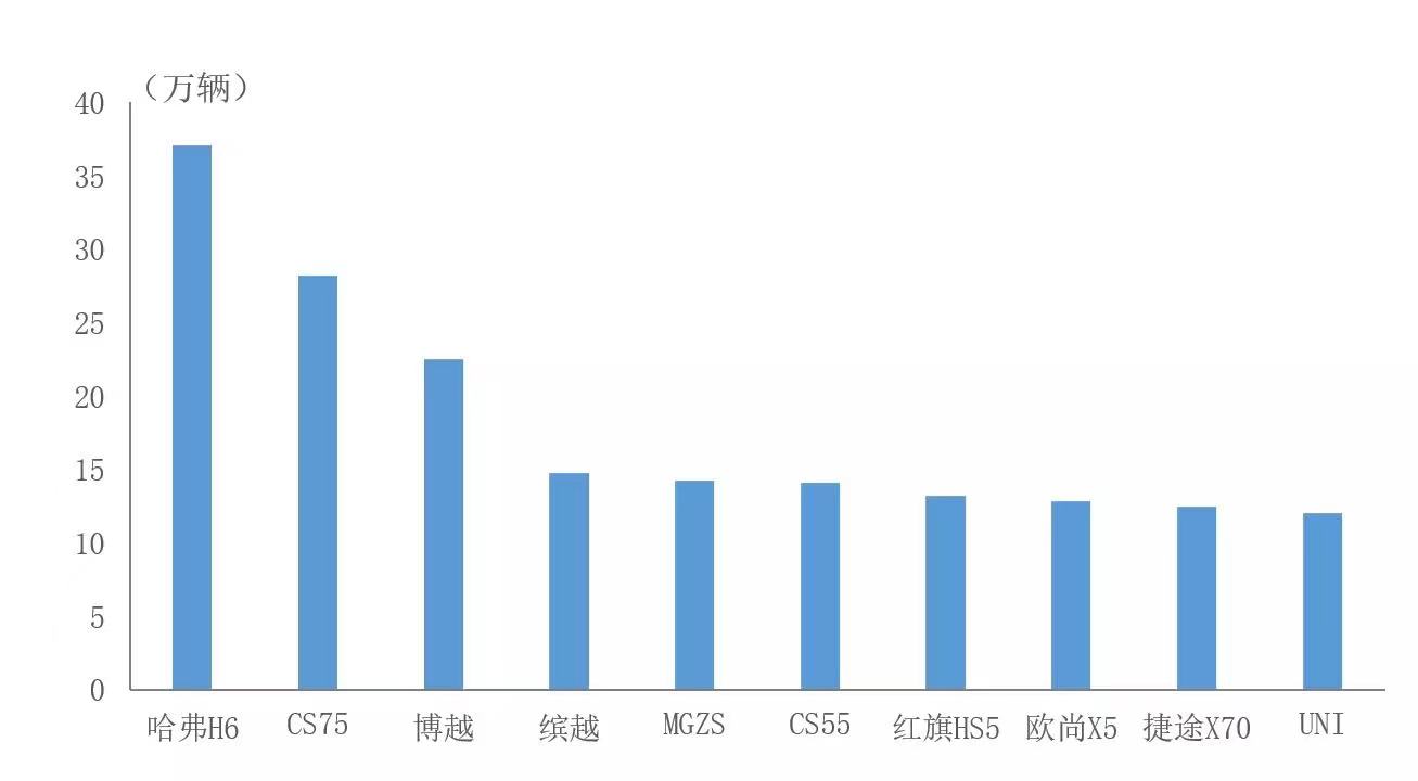 从销量排行榜单来看,哈弗H6、CS75、博越、缤越、MGZS、CS55、红旗HS5、欧尚X5、捷途X70和UNI位列前十名。与上年相比,哈弗M6和博越销量有所下降,其他品牌均呈增长。10款车型共销售181.2万辆,占中国品牌SUV销售总量的34.3%。