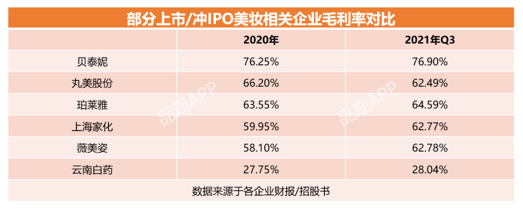 值得一提的是,2021年前三季度,其毛利率也由去年同期的57.8%上升至62.8%,这一毛利率表现并不逊色于已上市的美妆企业。